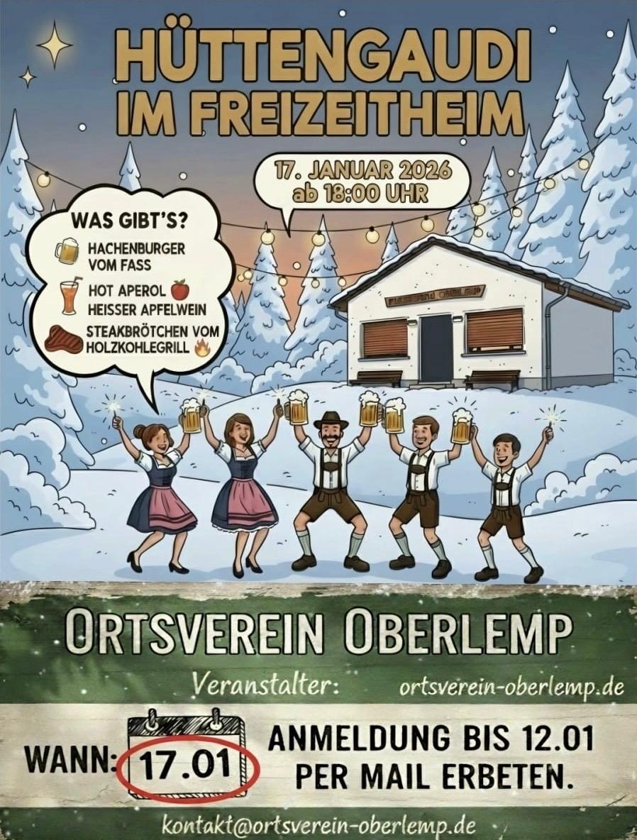 Der Ortsverein Oberlemp lädt zum diesjährigen Maibaumstellen ein.Um 17:00 Uhr starten wir mit den Traktoren in den Wald um den Maibaum zu holen.Am MIttwoch, den 30. April 2025 ab 16:00 Uhr auf dem Dorfplatz in Oberlemp.Wer möchte, kann sich gerne mit seinem Traktor anschließen.Für Essen und Getränke ist gesorgt.